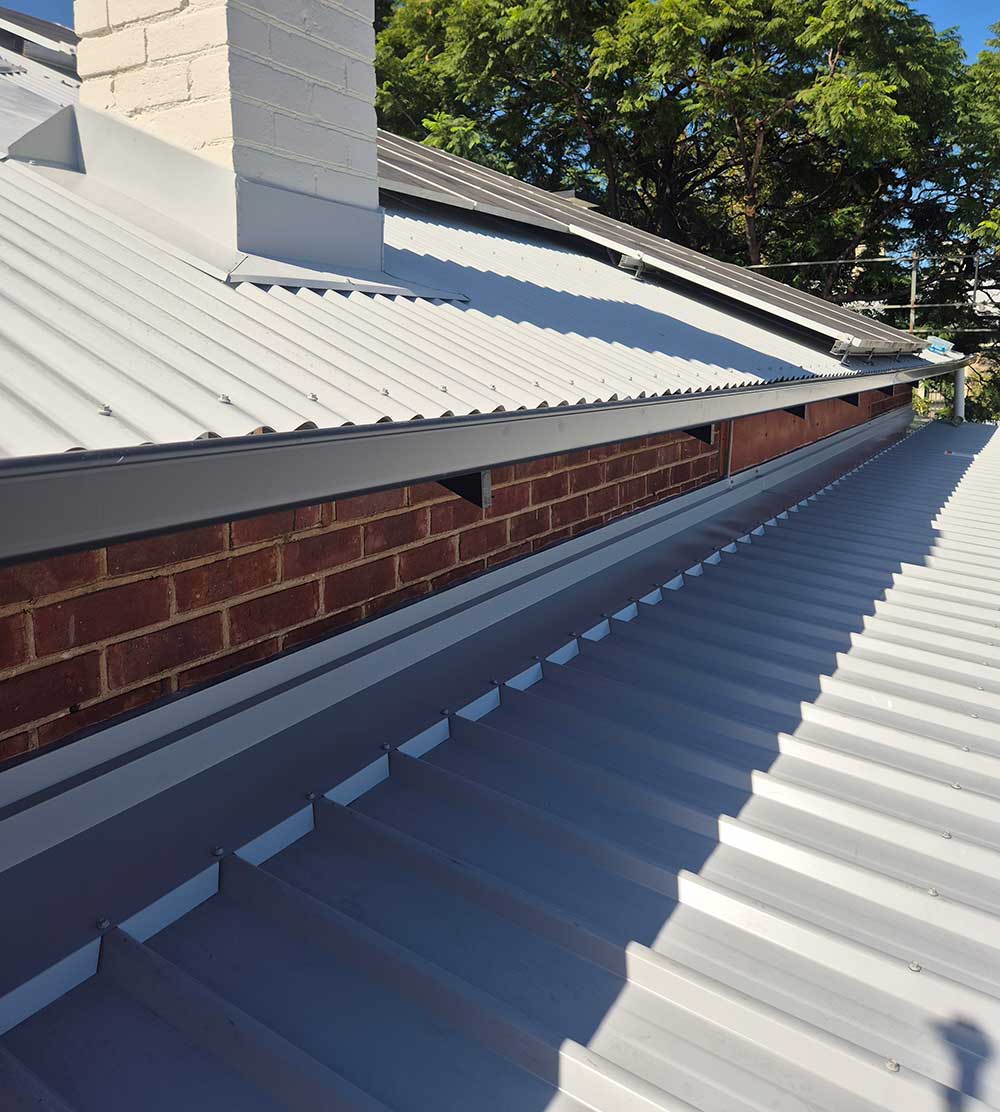 On the main roof, we match profiles to the pitch (often Corrugated or CUSTOM ORB), reset and the set-out so that lines run true, and renew ridges, hips, and valleys. Penetrations and chimney aprons are re-flashed, barges and parapets are finished neatly, and drainage is verified so water moves to gutters without backflow.